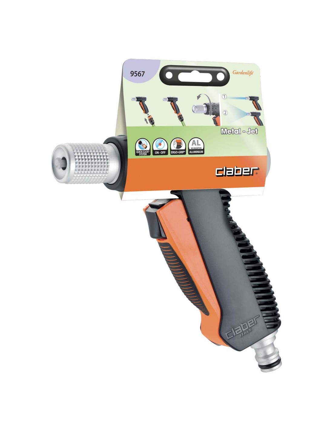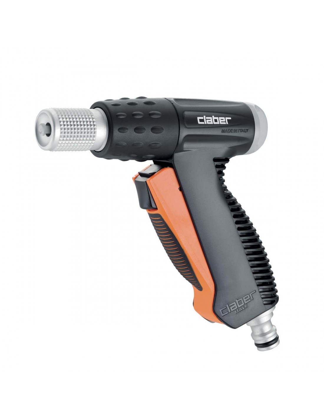 Lancia a pistola con componenti in metallo cromato resistente e inalterabile, impugnatura anatomica gommata e comodo meccanismo anteriore a pulsante per l’apertura e la chiusura del flusso. Manopola posteriore per regolare la portata d’acqua. Cappuccio ricoperto di gomma con funzione antiurto. Getto regolabile a piacere, da tutto chiuso (concentrato) a tutto aperto (diffuso a ventaglio).