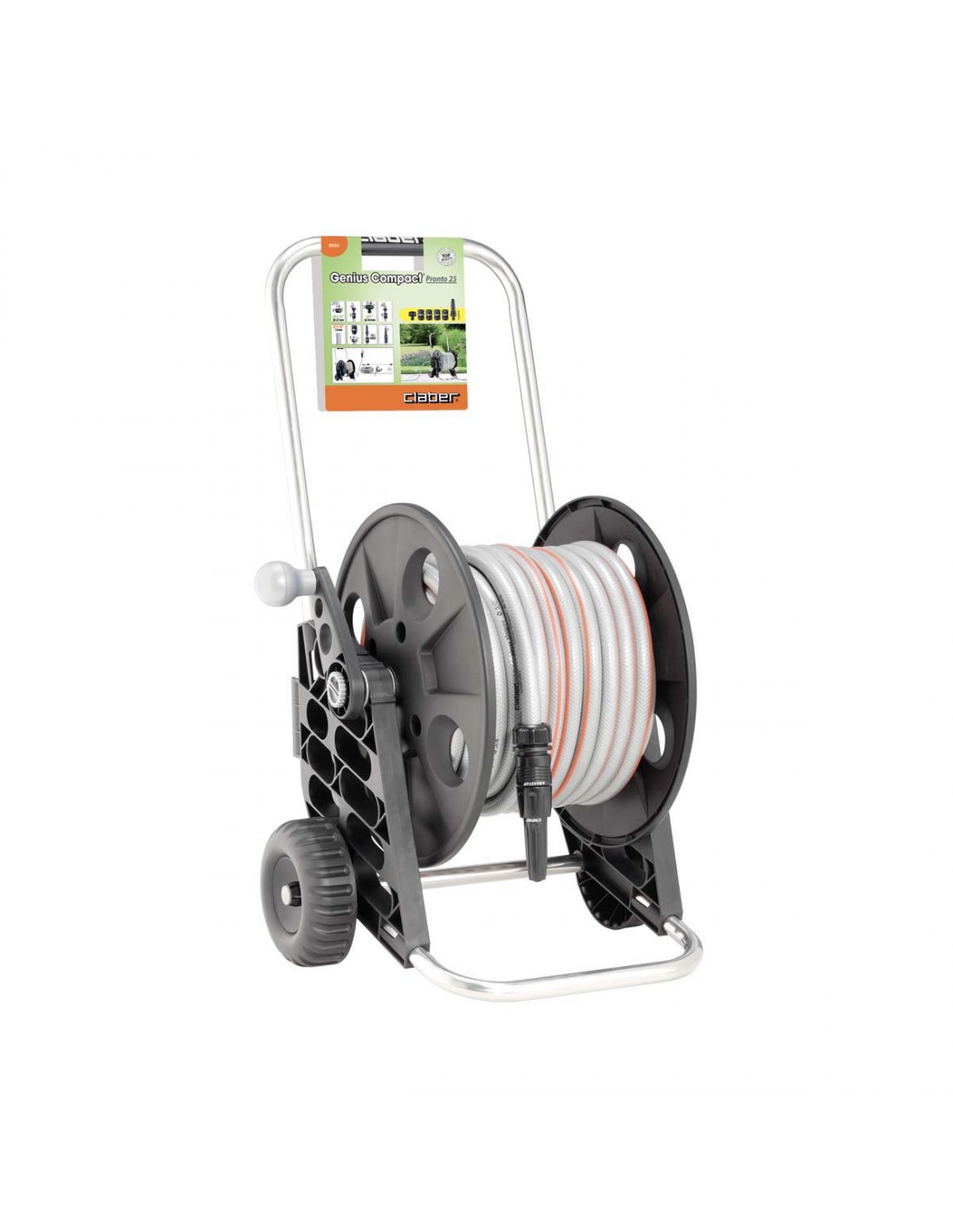 Carrello pronto all’uso. Telaio in alluminio inossidabile, traversi rinforzati e tamburo in PP. Manopola pivotante. Fornito completo di: 25 m di tubo Silver Elegant Plus Ø 5/8” (14-19 mm), 4 raccordi automatici (uno con aquastop), lanciaspruzzo, presa a rubinetto, forcella portagomma.