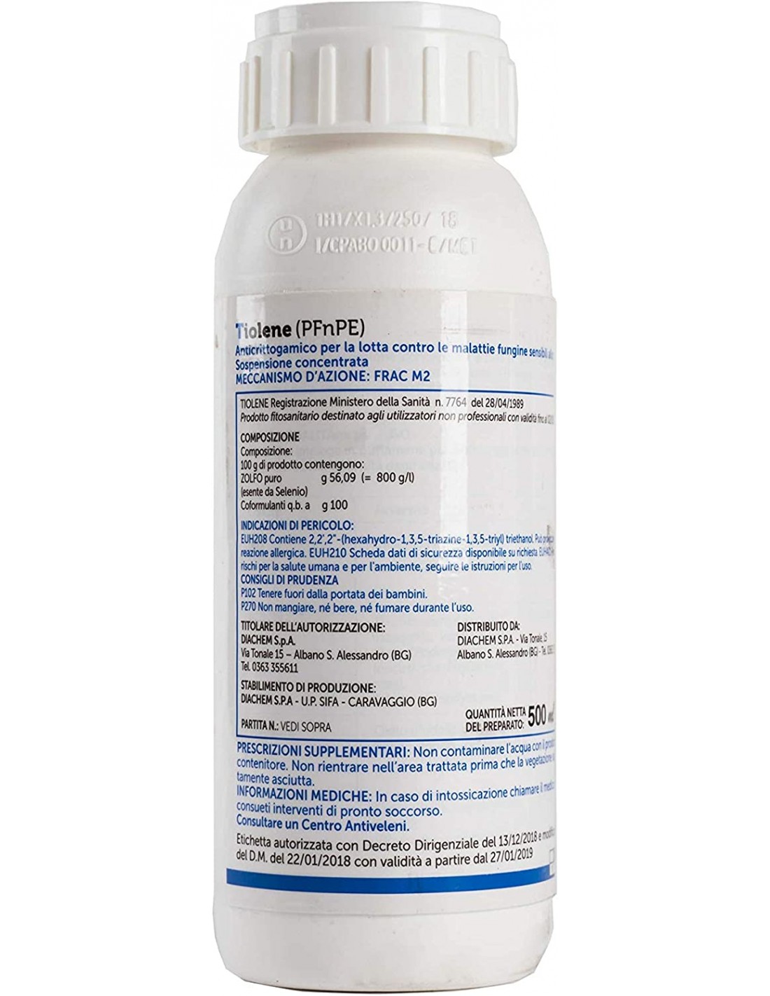 Tiolene è un fungicida Chimiberg biologico per la cura di tutte le forme di oidio su vite, pomacee, drupacee, nocciolo, pomodoro e altri ortaggi a frutto, cavoli, ortaggi a stelo in campo, legumi freschi e da granella, piante floreali, ornamentali e forestali, cereali. Consentito in agricoltura biologica.