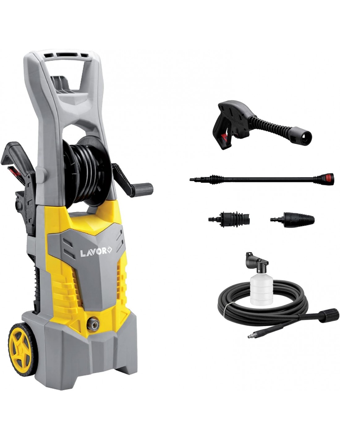 - Provvista di pistola e lancia con attacco rapido, tubo alta pressione lungo 5 m, 2 ugelli (Turbo e Variojet) e serbatoio per detergente.