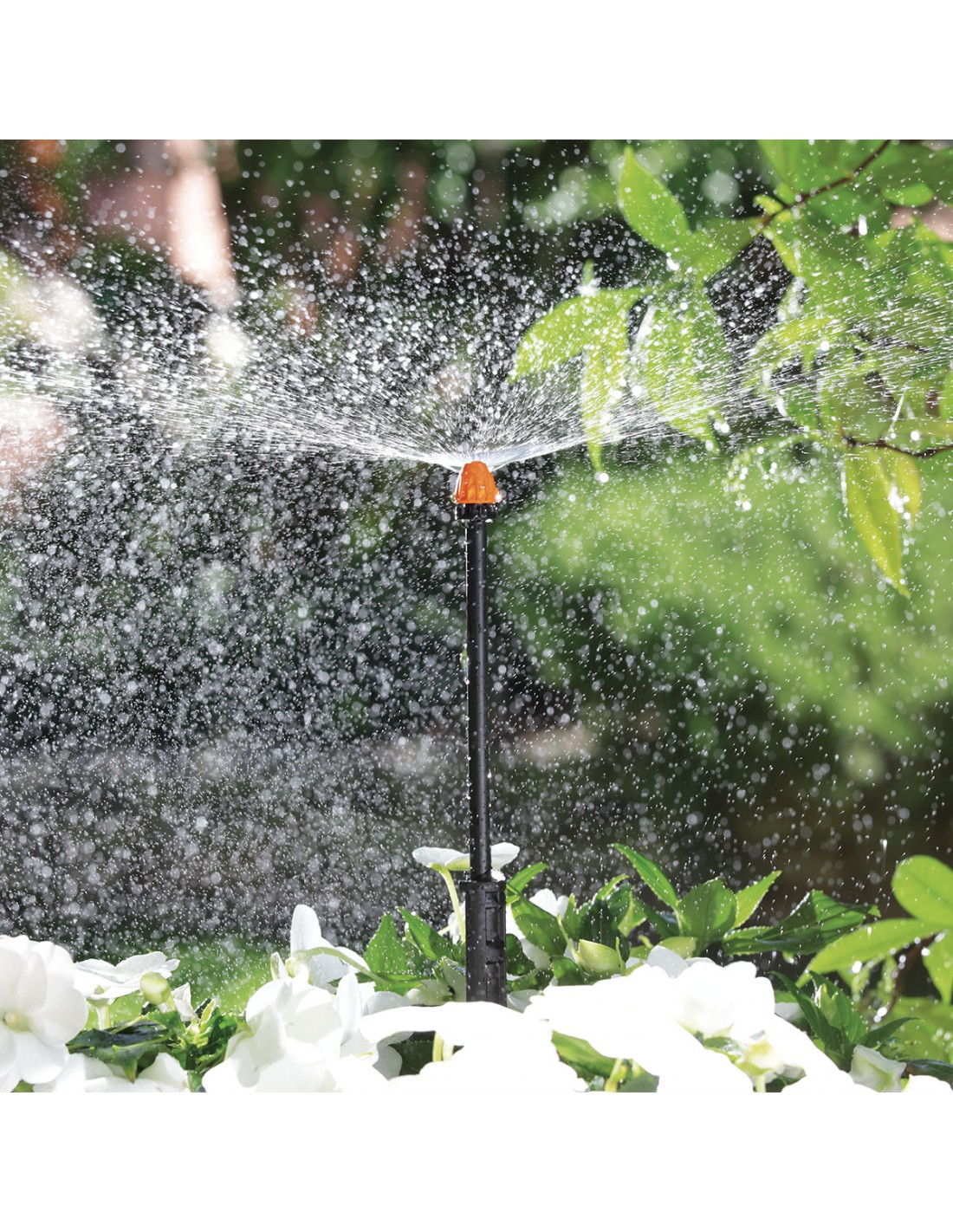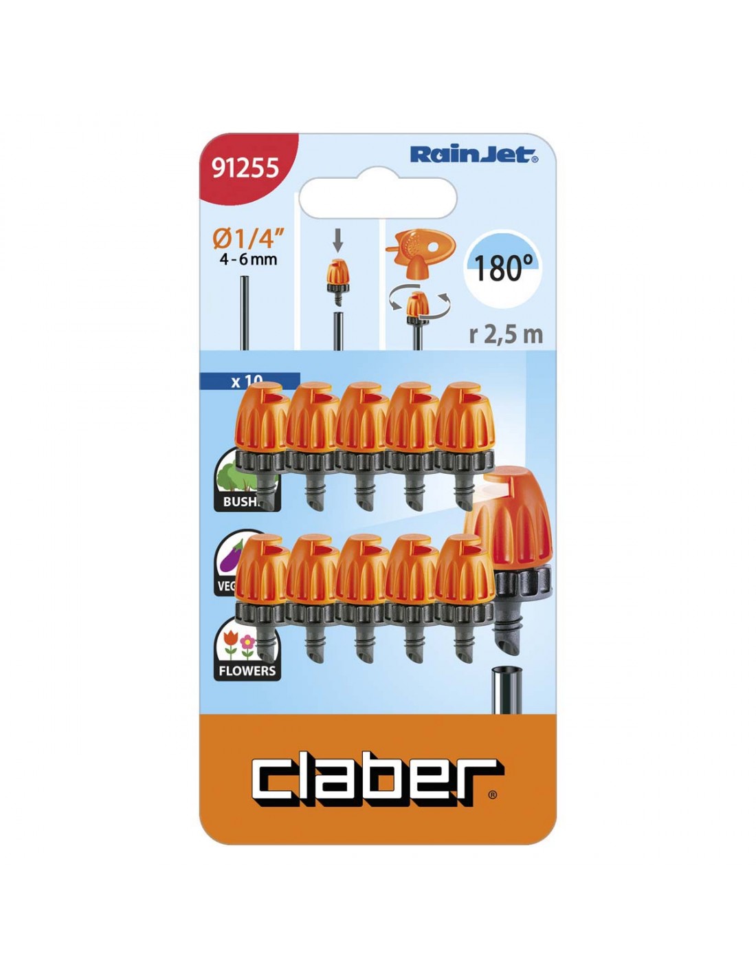Per irrigare superfici a semicerchio. Si applica sul tubo collettore da 1/2” (13-16 mm), sul capillare da 1/4” (4-6 mm) o sulle astine rigide per sollevarlo da terra. Blister da 10 pezzi. Area massima irrigabile 10 m².