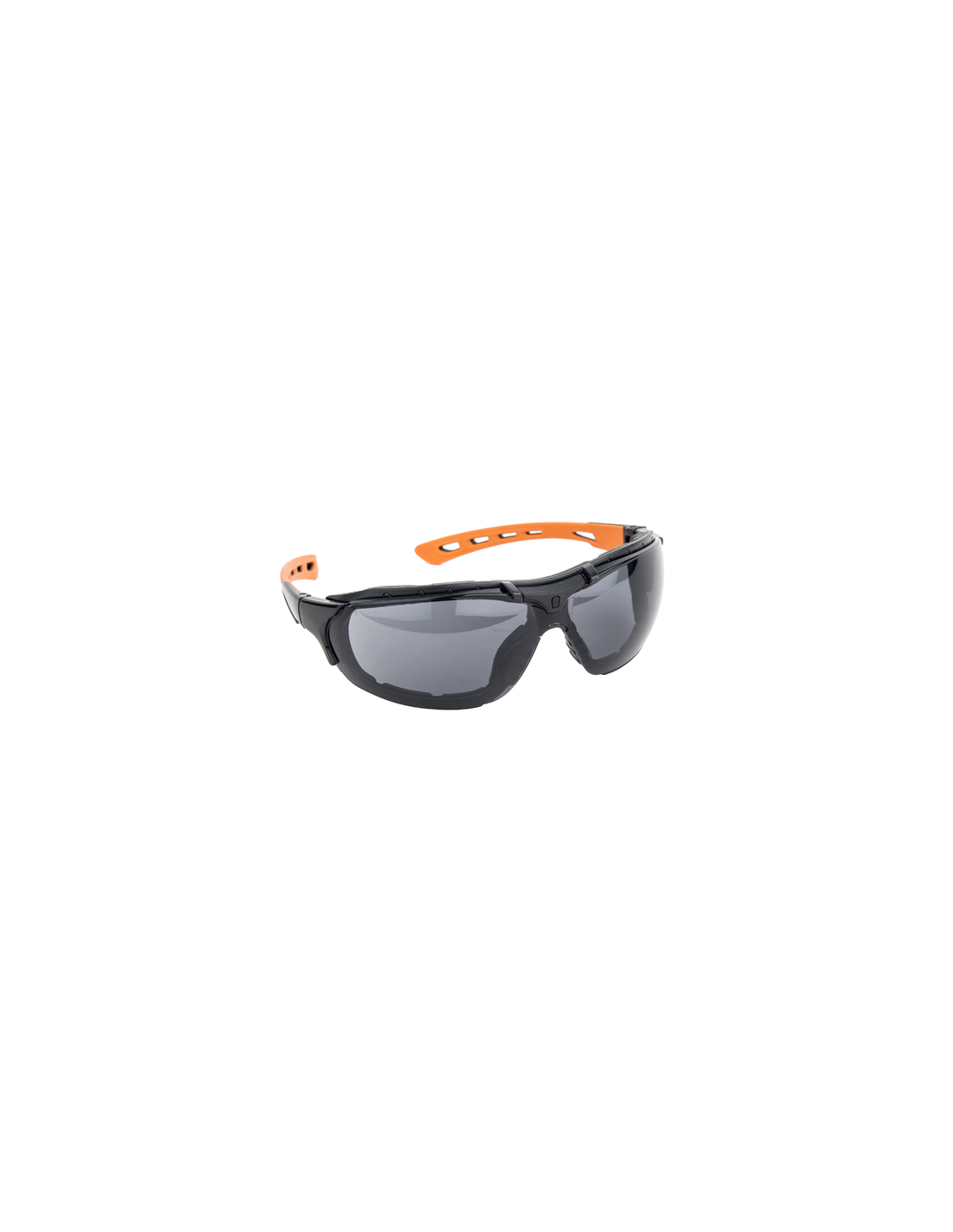 Occhiali di sicurezza COVERGUARD EUROLUX. Lente curva in policarbonato fumé, trattamento anti UV, N standard antiappannamento, resistenza a temperature estreme, montatura in policarbonato e TPR, aste in policarbonato e TPE con schiuma e cinturino, bordo in schiuma rimovibile, 0% metallo