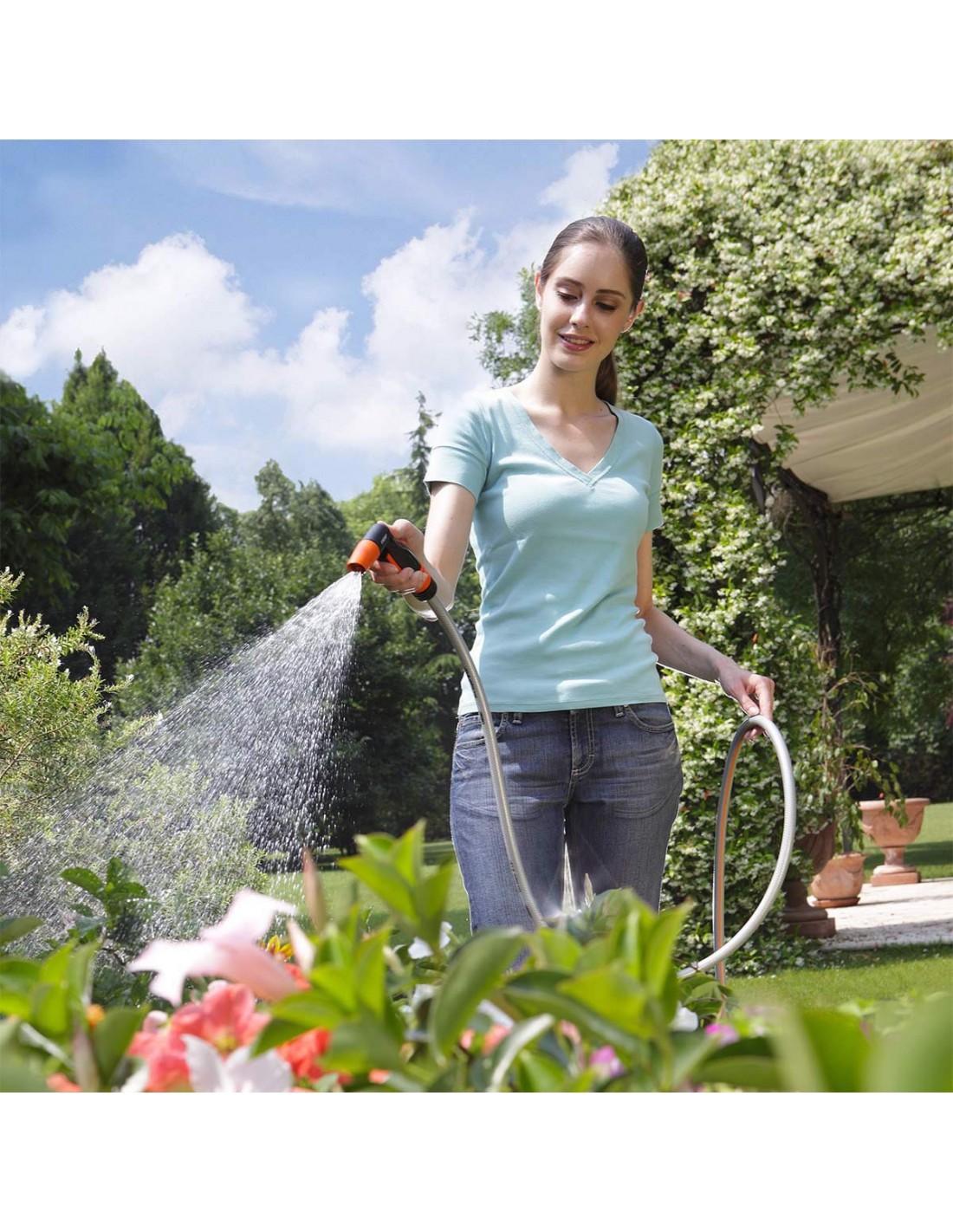 Versatile lancia a pistola, utilizzabile per annaffiare le piante ed anche per i lavori di pulizia all’aria aperta. Dotata di due getti diversi, concentrato o piatto, selezionabili semplicemente ruotando il cappuccio anteriore.