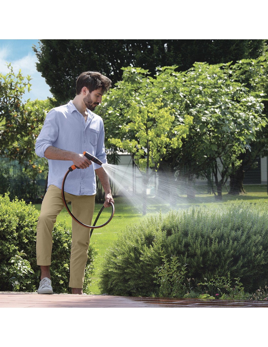 Lancia a pistola con impugnatura anatomica gommata e comodo meccanismo anteriore a pulsante per l’apertura e la chiusura del flusso. Manopola posteriore per regolare la portata d’acqua. Cappuccio ricoperto di gomma con funzione antiurto. Getto regolabile a piacere, da tutto chiuso (concentrato) a tutto aperto (diffuso a ventaglio).