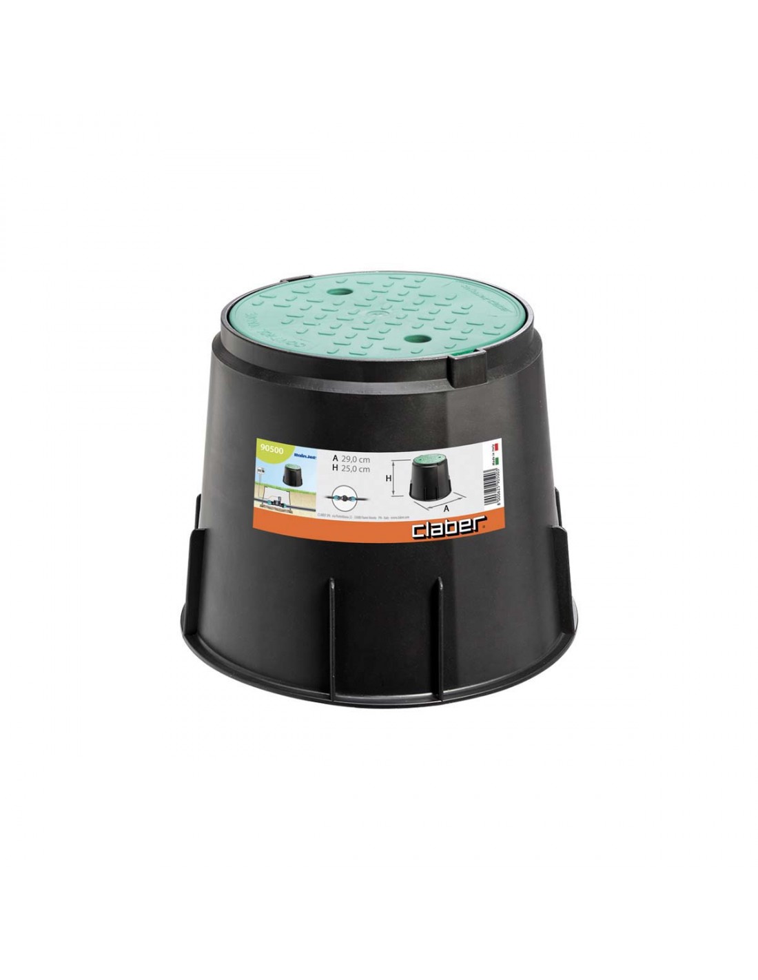 Forma circolare con coperchio a scatto. Aperture circolari alla base del pozzetto. Può contenere un' elettrovalvola.